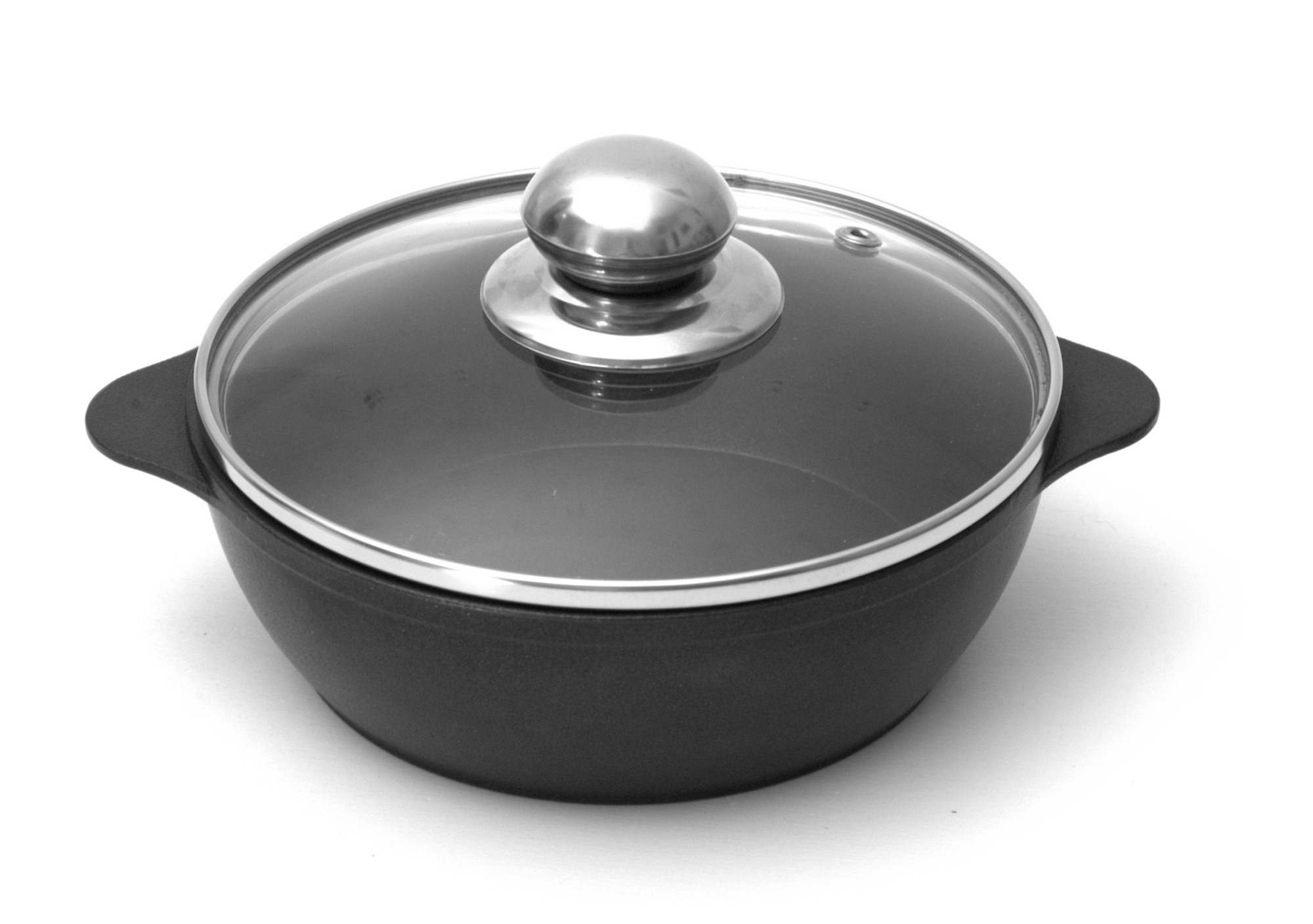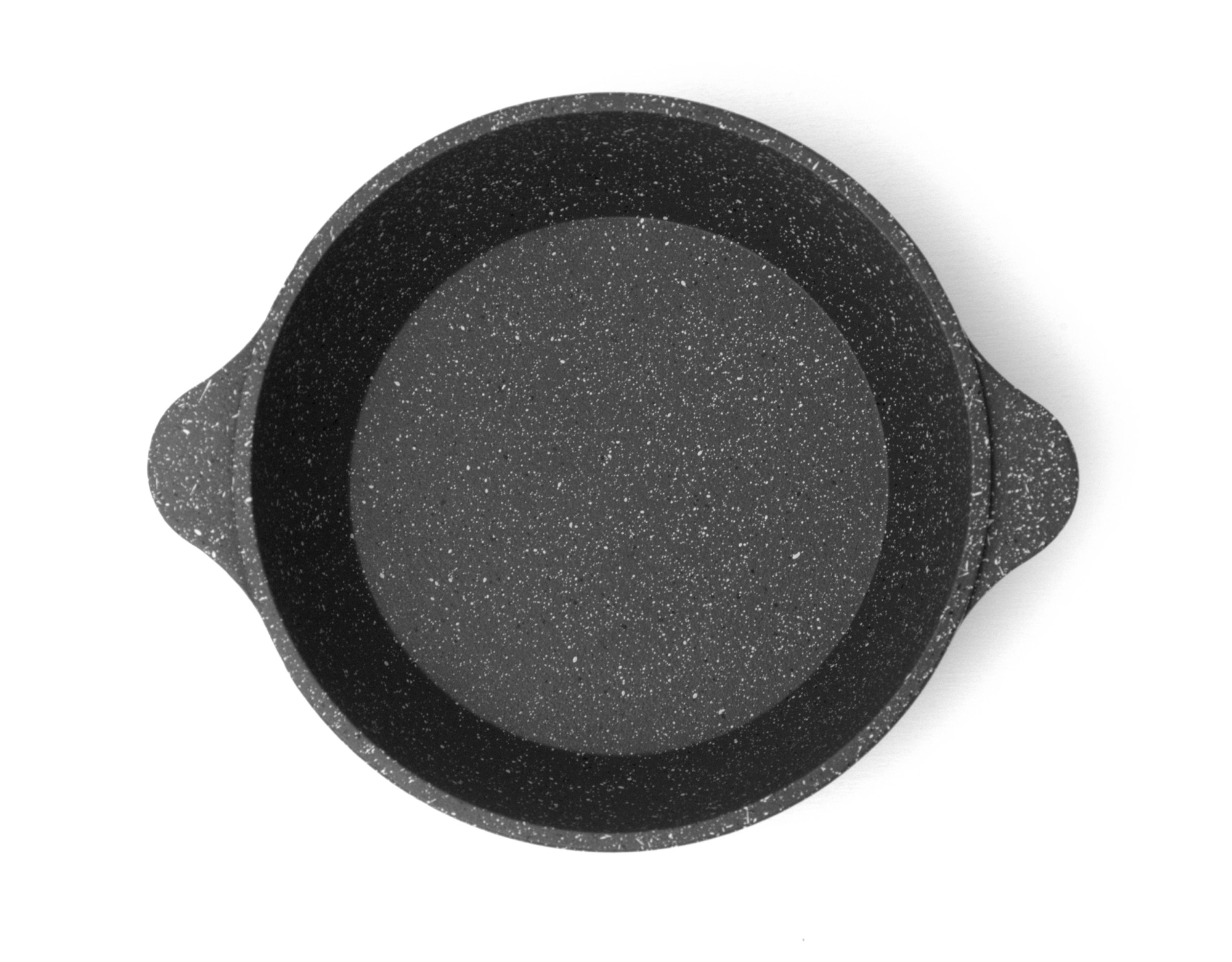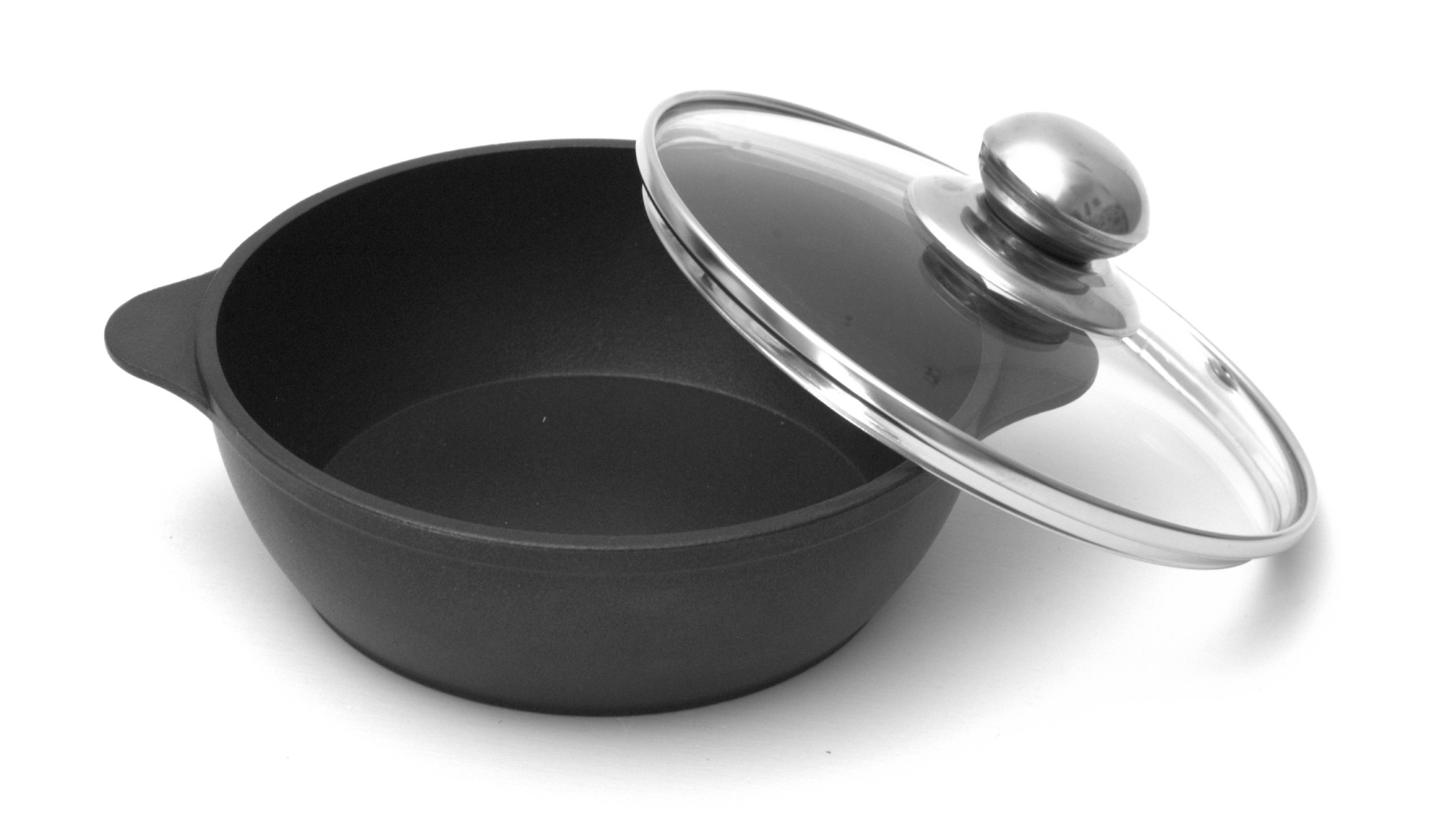 Литая алюминиевая сковородка с литыми ручками, утолщенным дном и антипригарным покрытием.