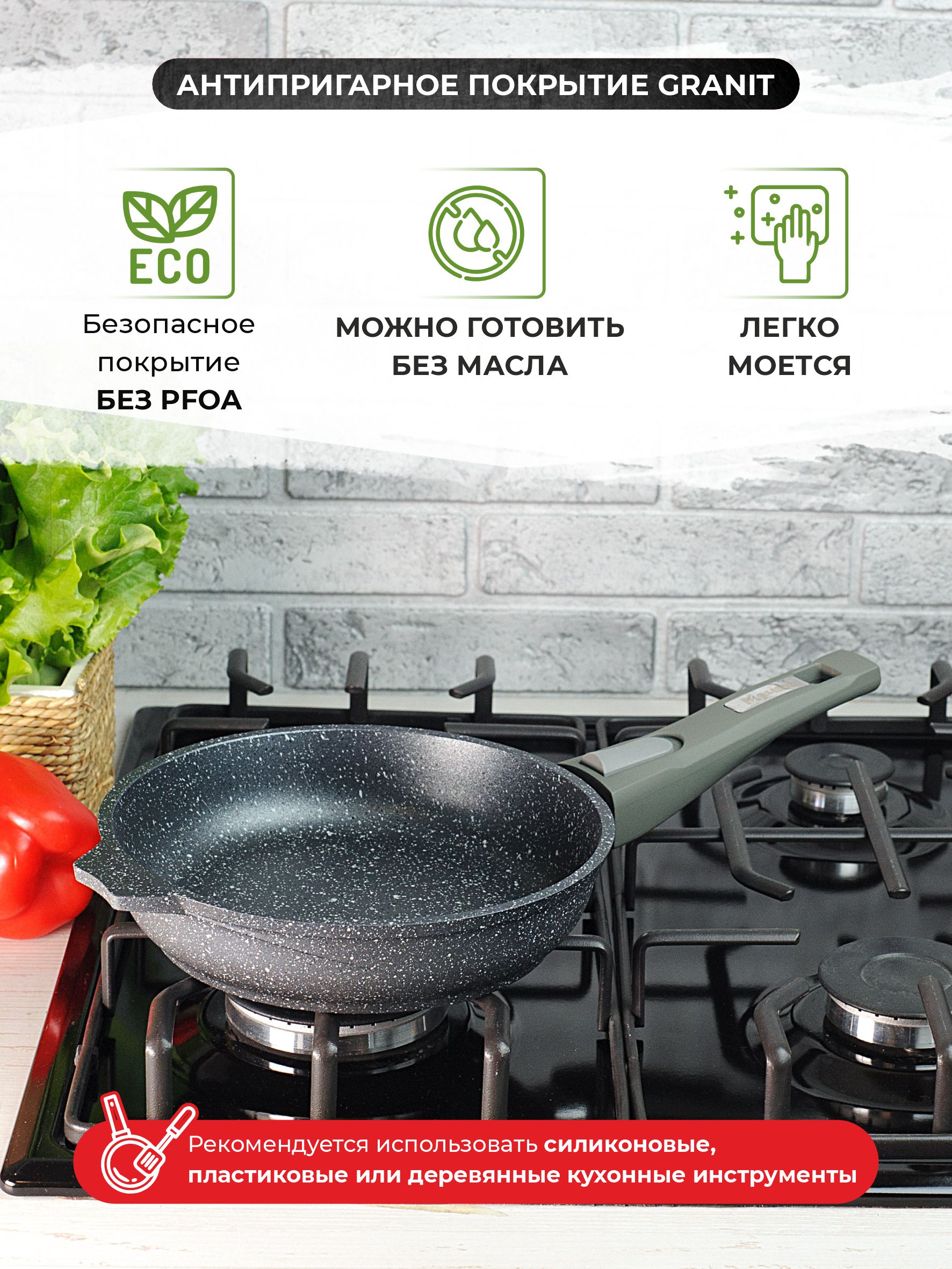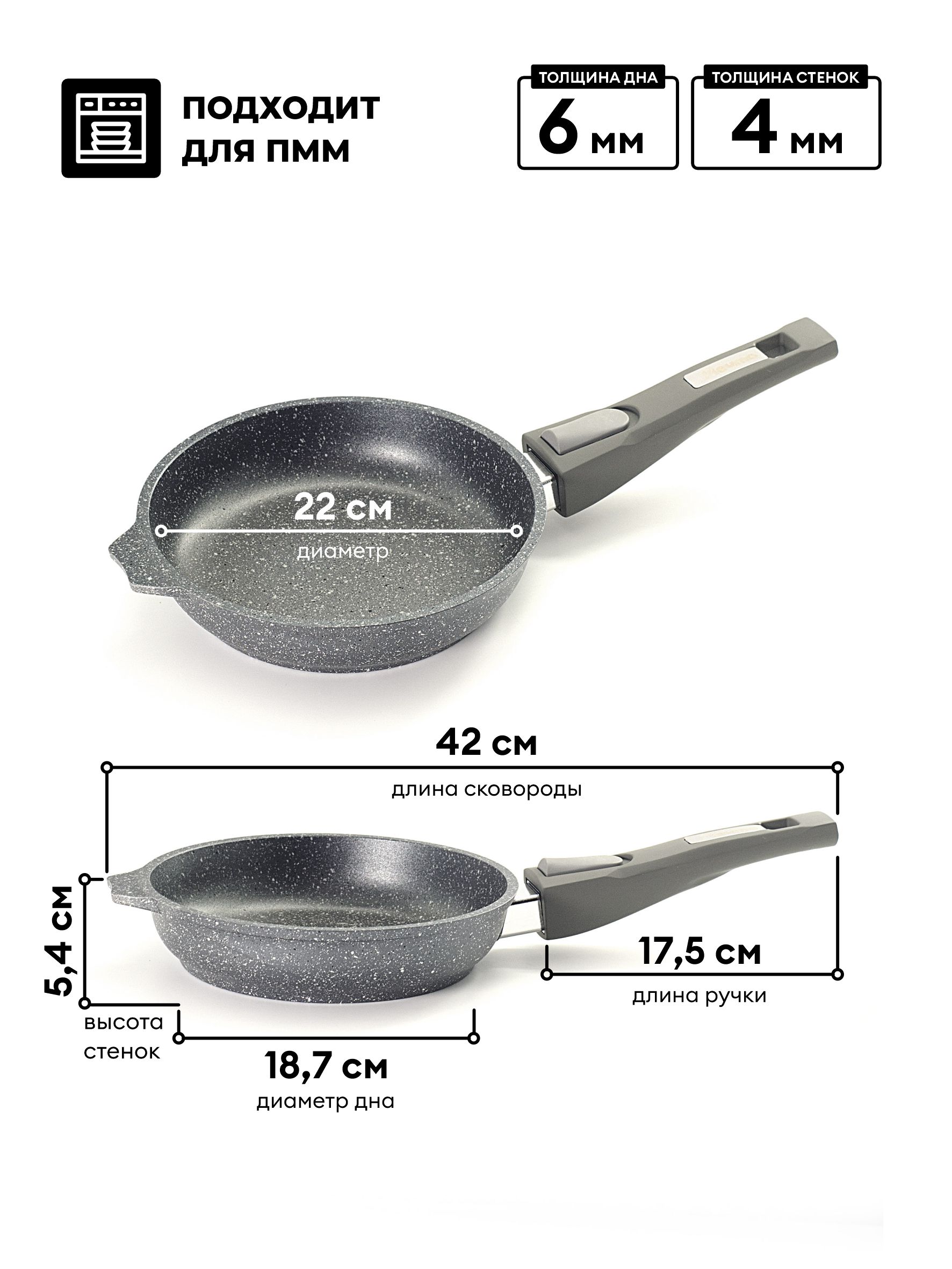 Сковорода из литого толстостенного алюминия "Мечта" станет незаменимым инструментом и надежным помощником на вашей кухне. Многофункциональная сковорода Гранит отлично подойдет для приготовления разнообразных блюд из мяса, рыбы и овощей. Благодаря термоаккумулирующим свойствам пищевого алюминия, пища на сковороде Гранит не пригорает, а томится, а благодаря новейшей формуле сверхпрочного антипригарного покрытия готовить можно при минимальном количестве масла не переживая за то что пища может пригореть. На посуде ТМ "Мечта" можно жарить, тушить и варить без потерь вкусовых и полезных качеств продуктов. Сковорода гранит из литого высококачественного пищевого алюминия "Мечта" станет незаменимым инструментом и надежным помощником на вашей кухне.Серия Гранит — это литая алюминиевая посуда с антипригарным покрытием повышенной стойкости, с содержанием частиц твердых минералов.