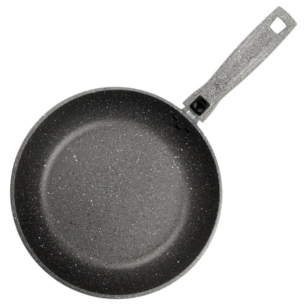 Сковорода "Vari Каменная" со съемной ручкой отличается эффектным дизайном: внешнее покрытие напоминает структуру мрамора и гранита. Корпус сковороды изготовлен из алюминия.
