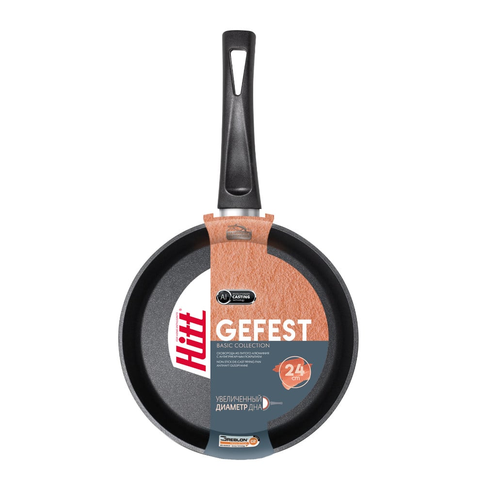 Сковорода Hitt Gefest изготовлена из литого алюминия методом ручного литья. Обладает прекрасными техническими характеристиками: толщина дна 4 мм, толщина стенок 3,5 мм, отличное двухслойное антипригарное покрытие немецкой марки Greblon C2+. Рекомендуется для ежедневного интенсивного использования. Характеризуется повышенной износостойкостью.