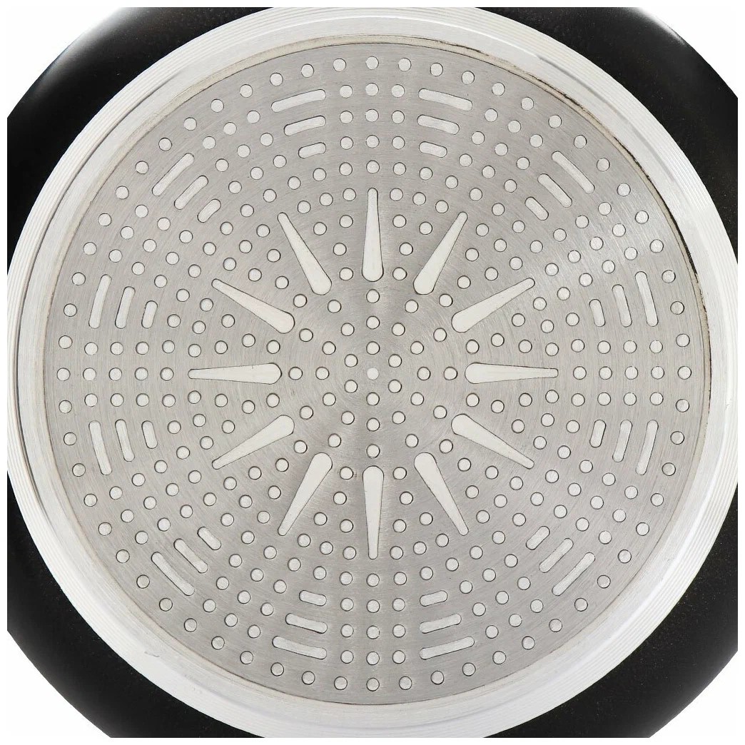 Отличительной особенностью сковороды "Футур" является дополнительно утолщенное армированное дно диском из нержавеющей стали, что позволяет использовать сковороду на любых типах плит включая индукционную.