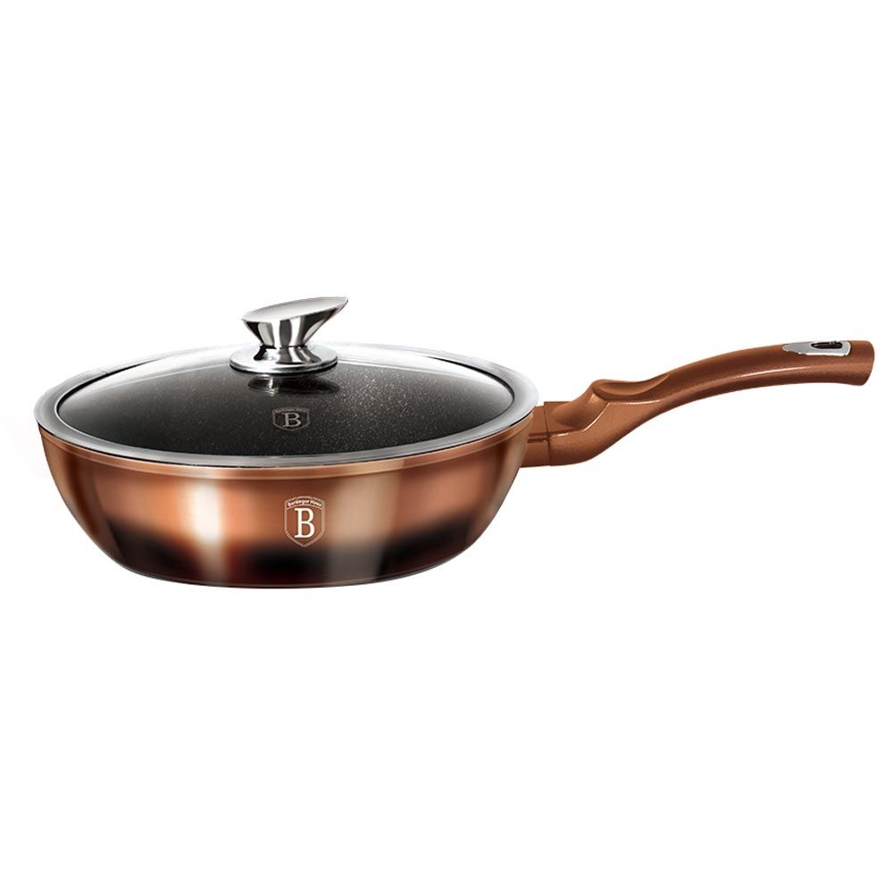Сковорода "Metallic Line"Rosegold Noir" выполнена из кованого алюминия с 3-х слойным мраморным покрытием. Равномерное распределение температуры по всей поверхности обеспечивает быстрое приготовление пищи. Изделие имеет эргономичную ручку с покрытием "Soft touch" для более удобной переноски. Подходит для всех видов плит.