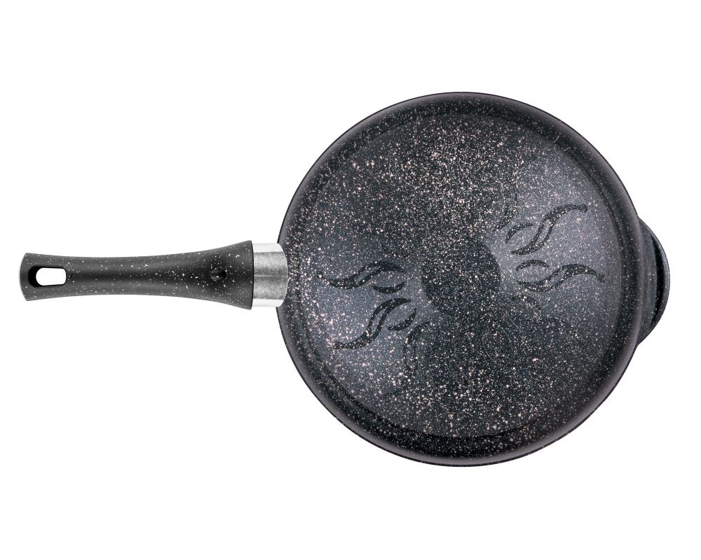 Сковорода изготовлена из высококачественного литого алюминия, который отличается исключительной долговечностью, равномерным нагревом и способностью сохранять тепло. Это способствует экономии энергии и ускоряет процесс приготовления пищи. Утолщенное дно обеспечивает равномерное распределение тепла, что положительно сказывается на качестве блюд.