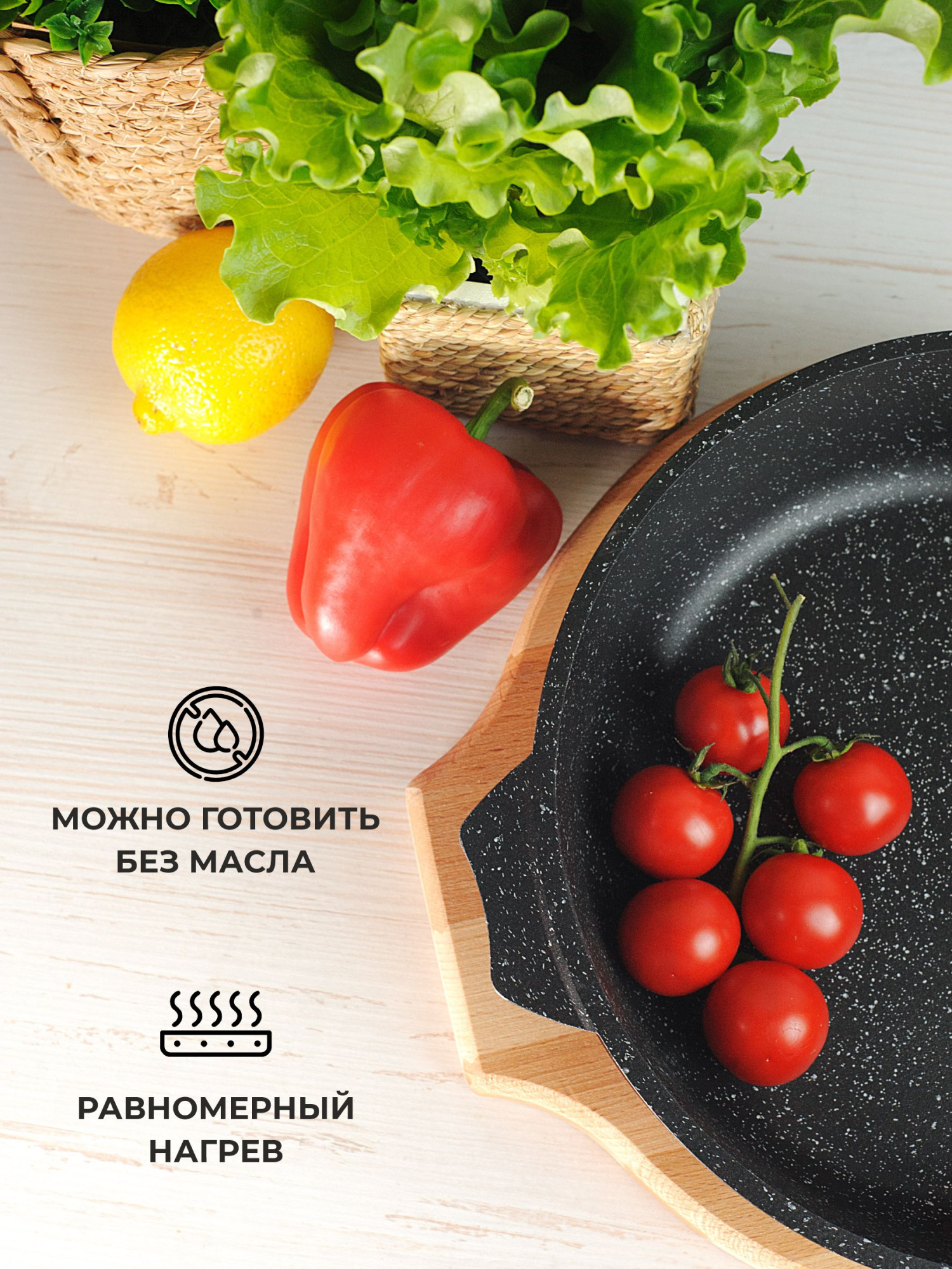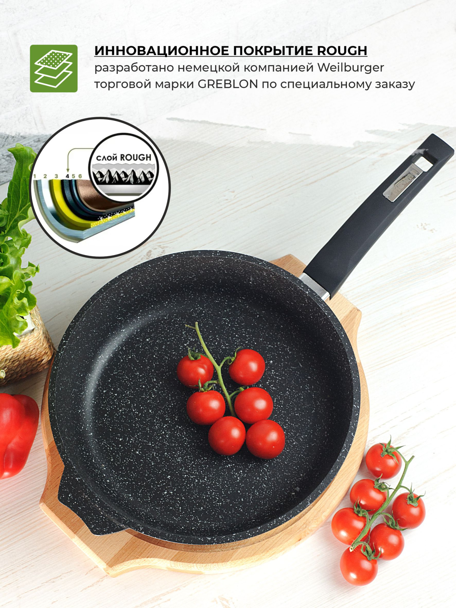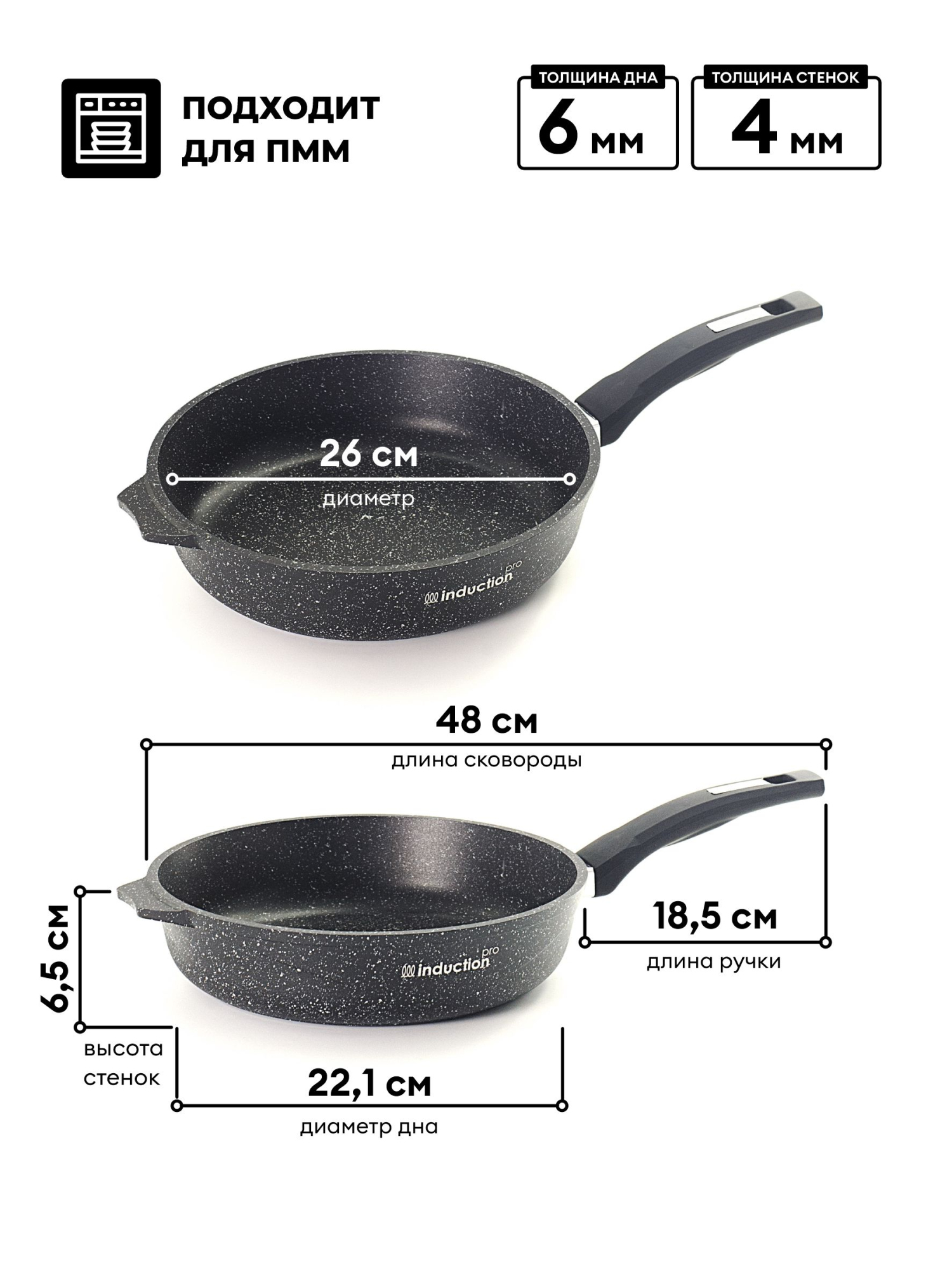 Индукционная антипригарная сковорода 26 см со съемной ручкой серии Мечта Гранит Black Induction Pro обладает рядом неоспоримых преимуществ: — сплошной индукционный диск (без перфорации). За счет увеличения площади увеличивается скорость и качество нагрева, снижается потребление электричества; — дно имеет большую толщину, что исключает деформацию при быстром и сильном нагревании; — индукционный диск впаян в корпус. В отличие от метода прессования перфорированного дна это обеспечивает лучший контакт с поверхностью, положительно влияет на скорость и равномерность нагрева; — на дно нанесено защитное антипригарное покрытие. Подходит для любых плит, включая индукционные. Цвет — черный гранит. Снабжена удобной съемной ручкой soft-touch.