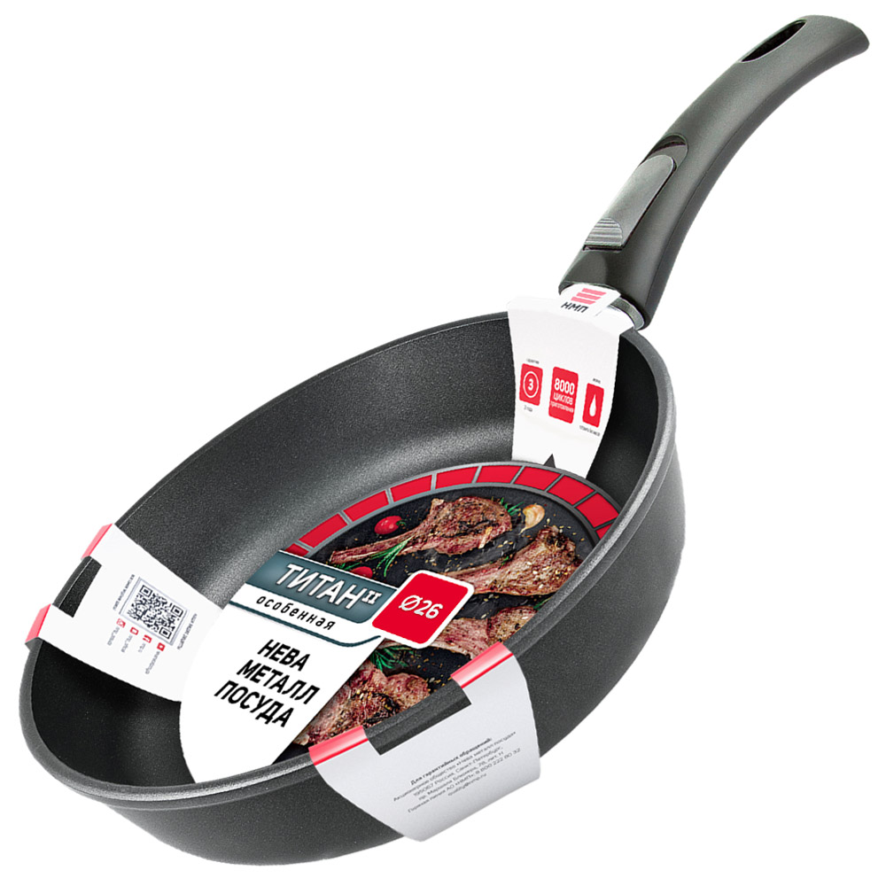 Сковорода НМП "Особенная" выполнена из литого алюминия с полимер-керамическим антипригарным покрытием "Титан", которое содержит 4 слоя: