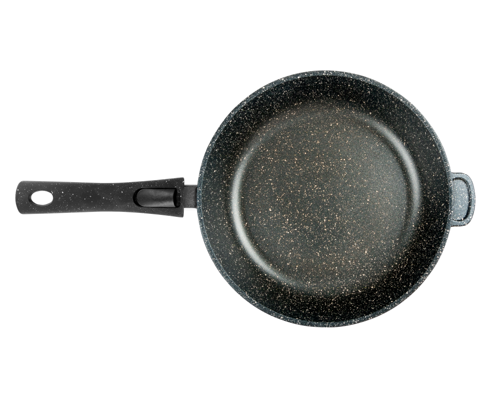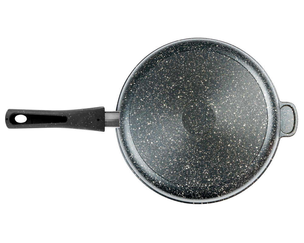 Сковорода изготовлена из высококачественного литого алюминия, который отличается исключительной долговечностью, равномерным нагревом и способностью сохранять тепло. Это способствует экономии энергии и ускоряет процесс приготовления пищи. Утолщенное дно обеспечивает равномерное распределение тепла, что положительно сказывается на качестве блюд.