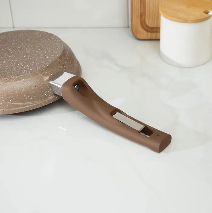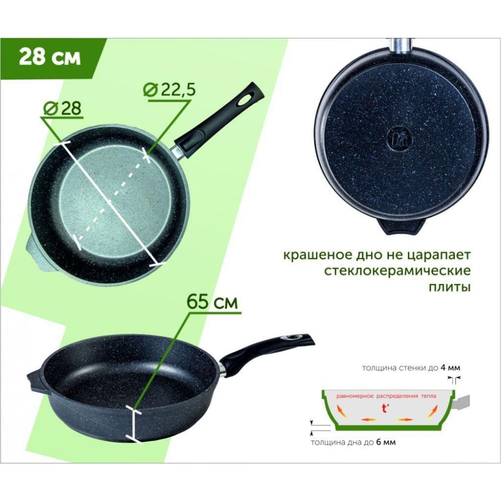 Сковорода из литого толстостенного алюминия «Мечта» станет незаменимым инструментом и надежным помощником на вашей кухне. Многофункциональная сковорода Гранит отлично подойдет для приготовления разнообразных блюд из мяса, рыбы и овощей. Благодаря термоаккумулирующим свойствам пищевого алюминия, пища на сковороде Гранит не пригорает, а томится, а благодаря новейшей формуле сверхпрочного антипригарного покрытия готовить можно при минимальном количестве масла не переживая за то что пища может пригореть. На посуде ТМ «Мечта» можно жарить, тушить и варить без потерь вкусовых и полезных качеств продуктов. Сковорода гранит из литого высококачественного пищевого алюминия «Мечта» станет незаменимым инструментом и надежным помощником на вашей кухне.Серия Гранит — это литая алюминиевая посуда с антипригарным покрытием повышенной стойкости, с содержанием частиц твердых минералов.