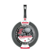 Универсальная сковорода НМП с покрытием с эффектом натурального камня - "серый гранит". Покрытие многослойное на водно-кремниевой основе, не содержит PFOA (перфтороктановую кислоту), безопасно для контакта с пищевыми продуктами, а также в производстве и для окружающей среды.