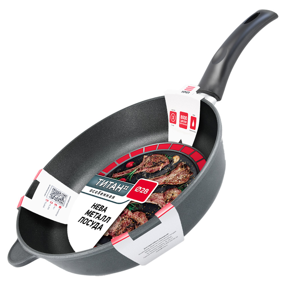 Сковорода НМП "Особенная" выполнена из литого алюминия с полимер-керамическим антипригарным покрытием "Титан", которое содержит 4 слоя:
