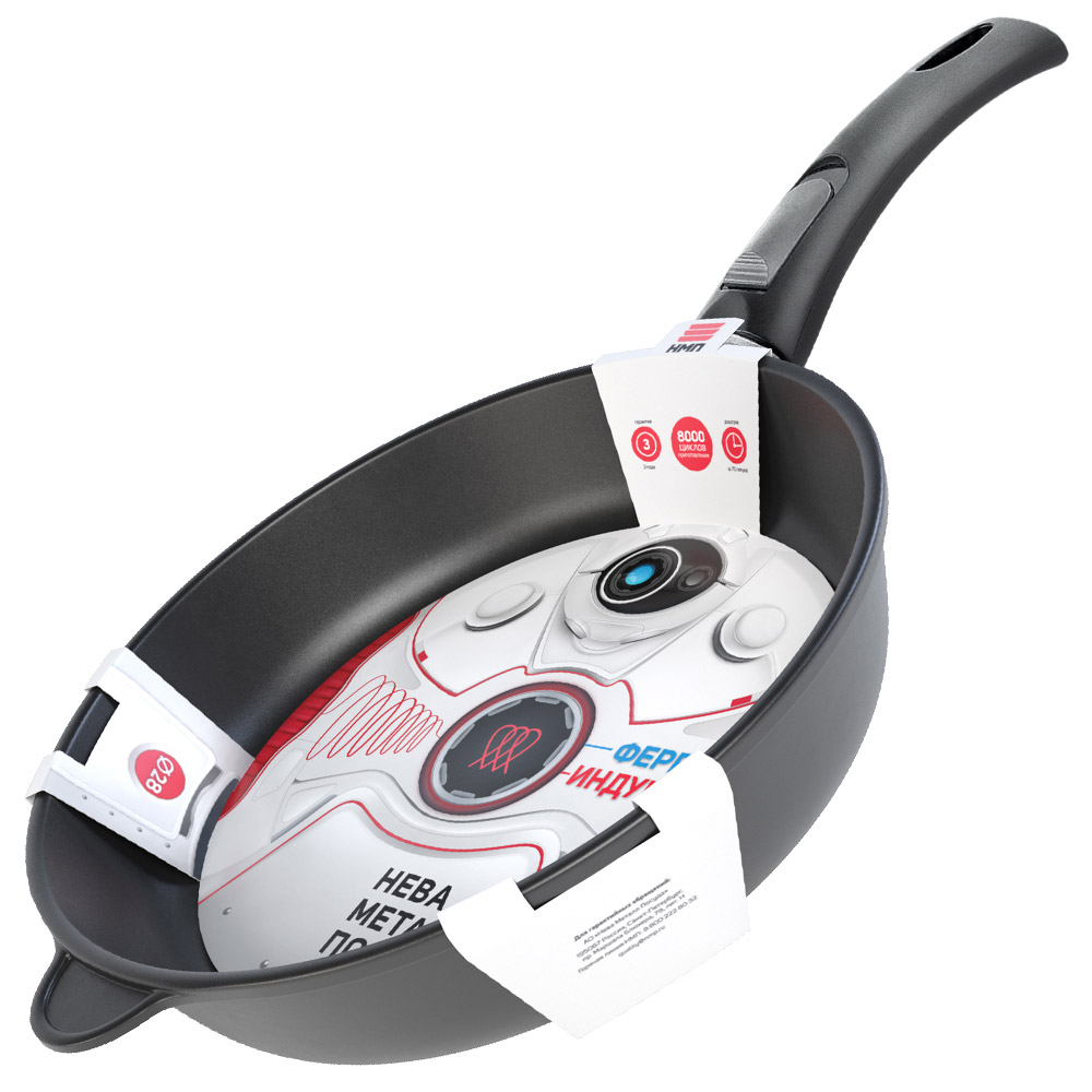 Ферромагнитный диск вплавлен в корпус сковороды, эта технология позволяет использовать посуду серии не только для индукционных плит, но и для всех типов варочных поверхностей.
