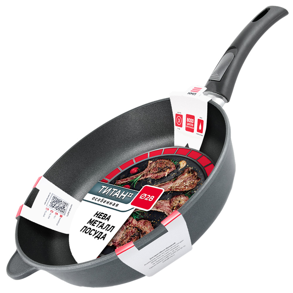 Сковорода НМП "Особенная" выполнена из литого алюминия с полимер-керамическим антипригарным покрытием "Титан", которое содержит 4 слоя: