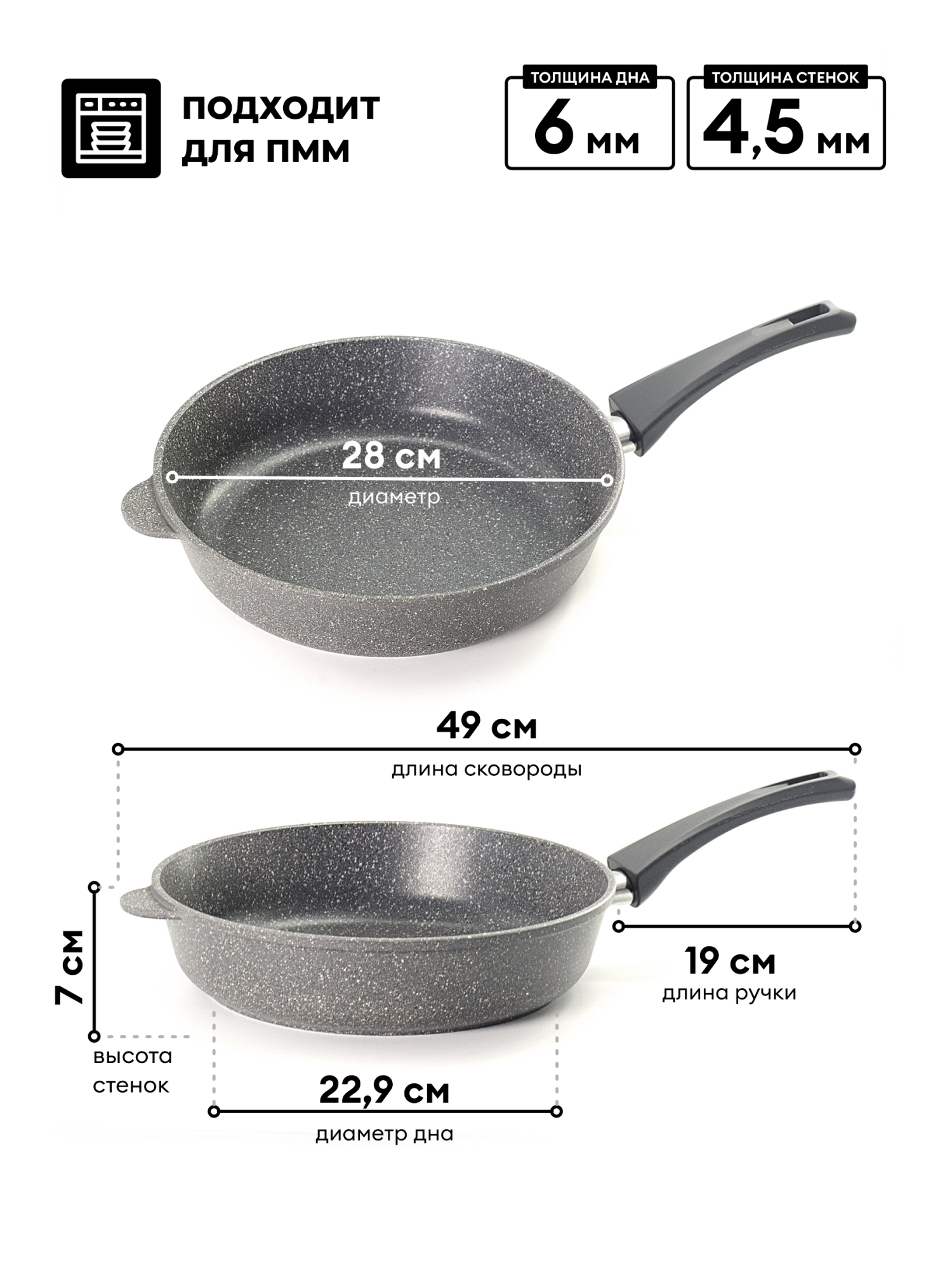 Качественные ручки удобной формы, выполнены из термостойкого пластика, обеспечивают дополнительный комфорт во время использования. Изделие подходит для газовых, электрических и стеклокерамических плит.