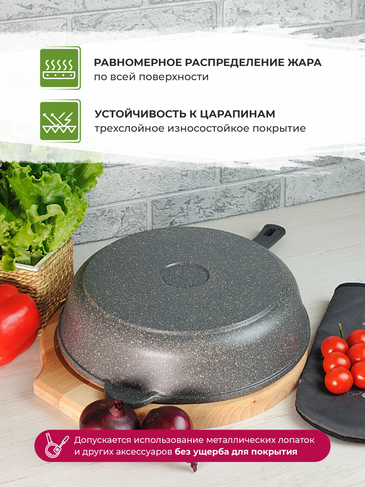 Литой корпус сковороды обеспечивает равномерное распределение и длительное сохранение тепла, что позволяет готовить блюда любой сложности.