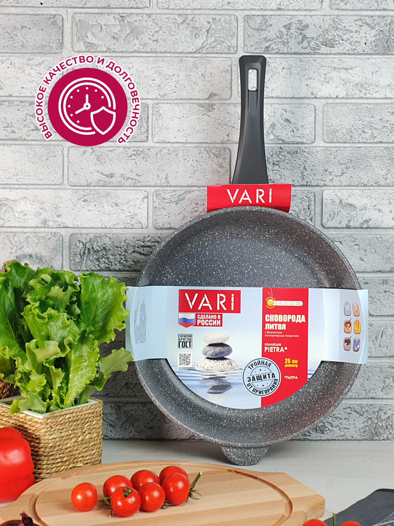 Сковорода Vari "Pietra" изготовлена литого алюминия с утолщенным дном.