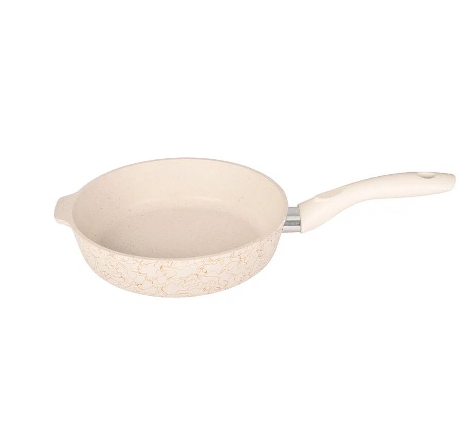 Сковорода Kukmara с антипригарным покрытием имеет проточенное дно, которое обеспечивает максимальное прилегание дна посуды к плите для более быстрого и равномерного нагрева.