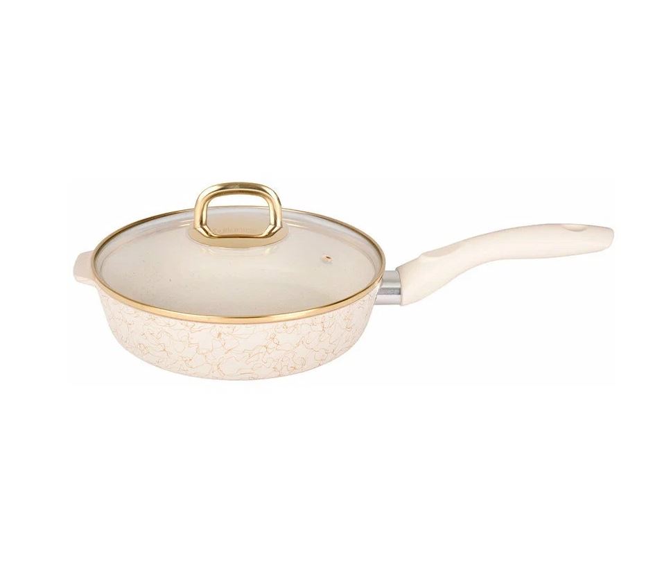 Оригинальная отделка внешней поверхности с помощью золотых нитей, придающих посуде особое изящество и богатство, а так же уникальное внутреннее противопригорающее покрытие, обладающее исключительными антипригарными свойствами, прочностью и износостойкостью, не содержит PFOA, кадмий, свинец и полностью безопасно. Высокая прочность антипригарного покрытия позволяет использовать неострые кухонные металлические принадлежности.