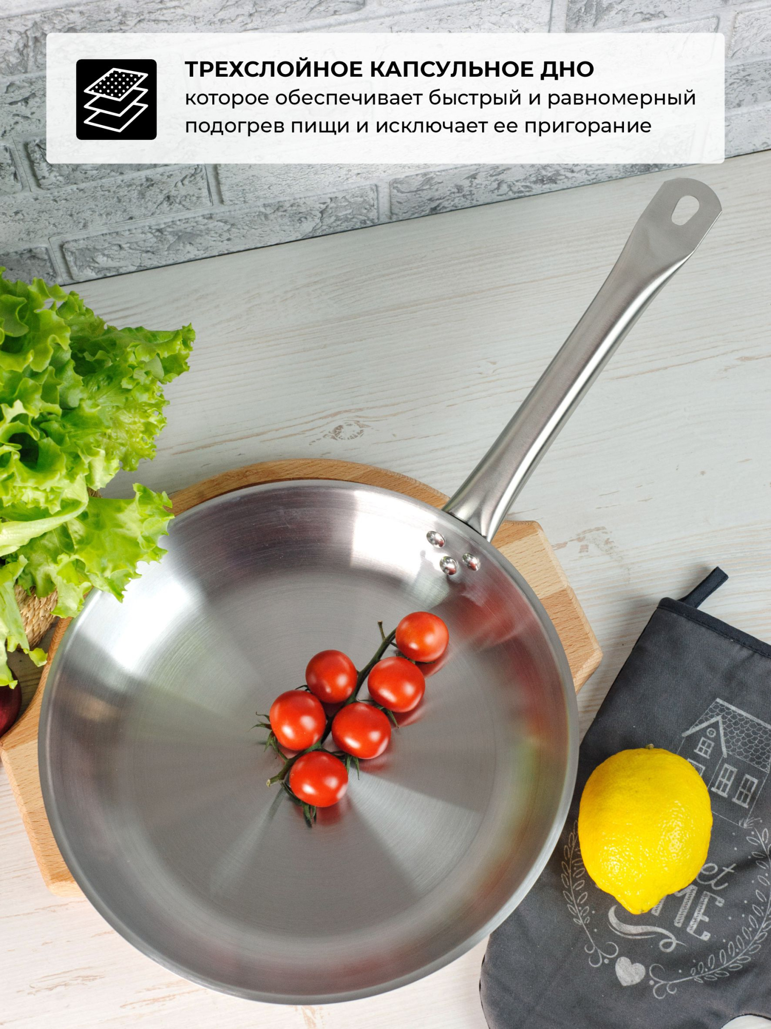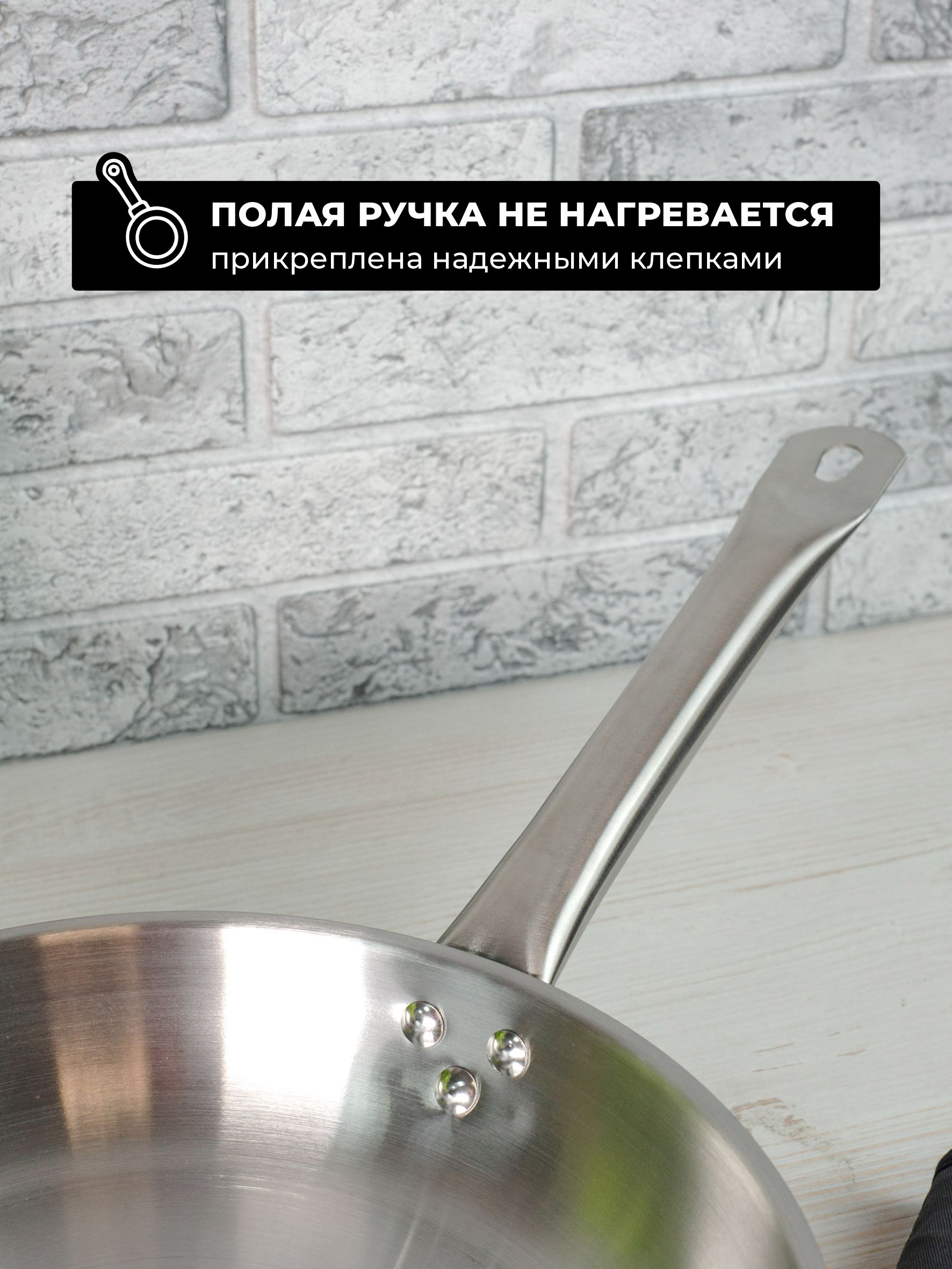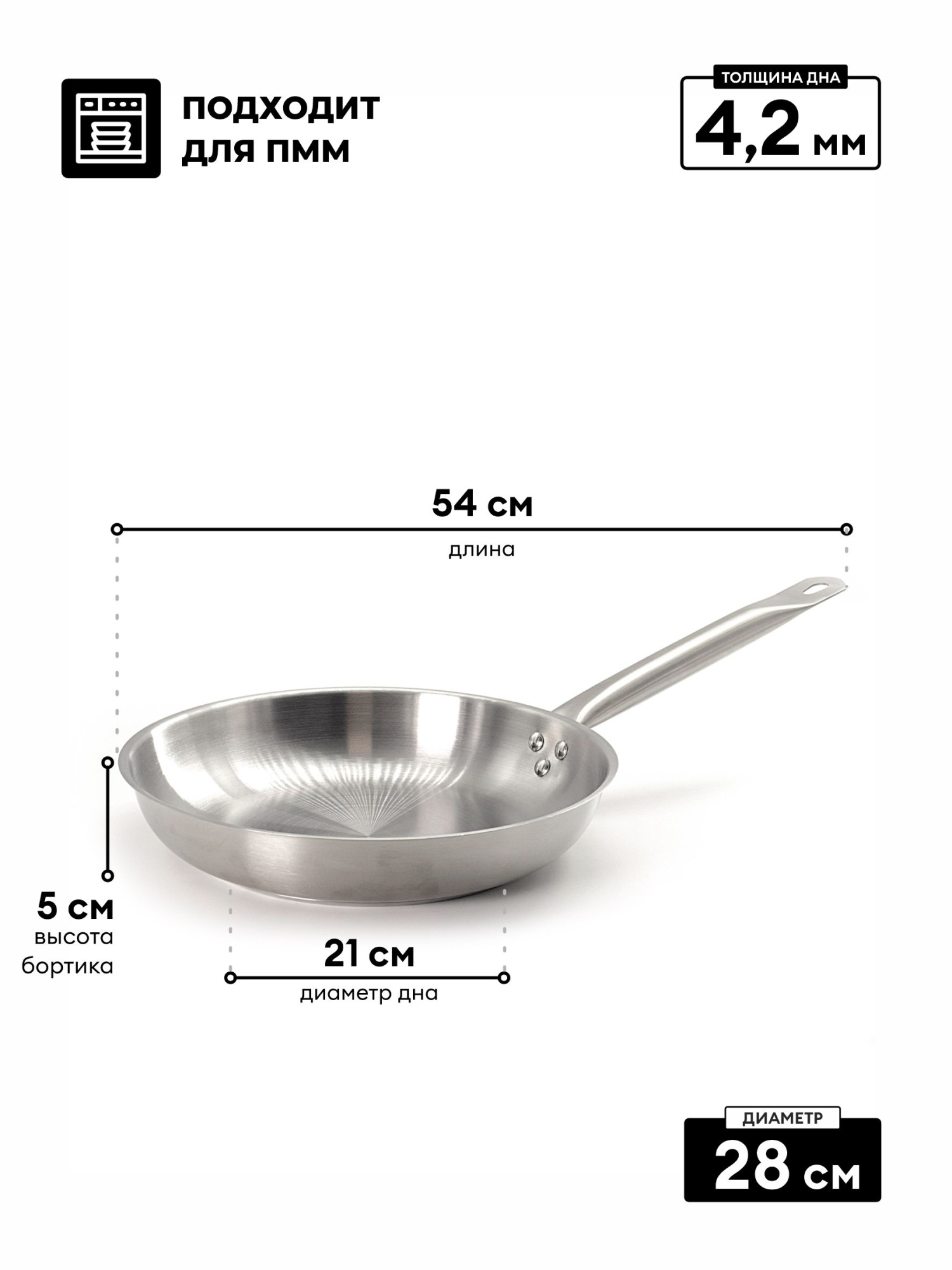 Диаметр верхний: 280 мм, Диаметр дна:210 мм, Высота: 50 мм, тройное дно, подходит для индукционной плиты