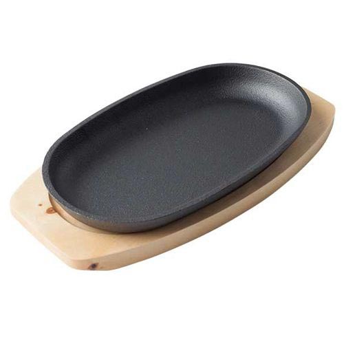 Порционная сковорода имеет овальную форму и комплектуется деревянной подставкой.