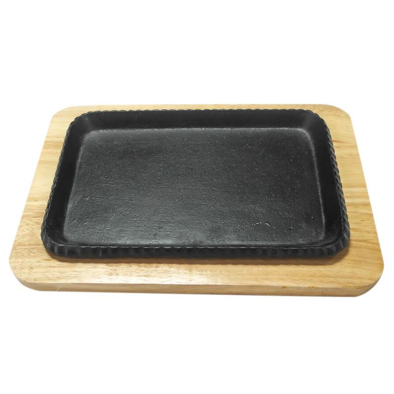 Порционная сковорода имеет прямоугольную форму и комплектуется деревянной подставкой.