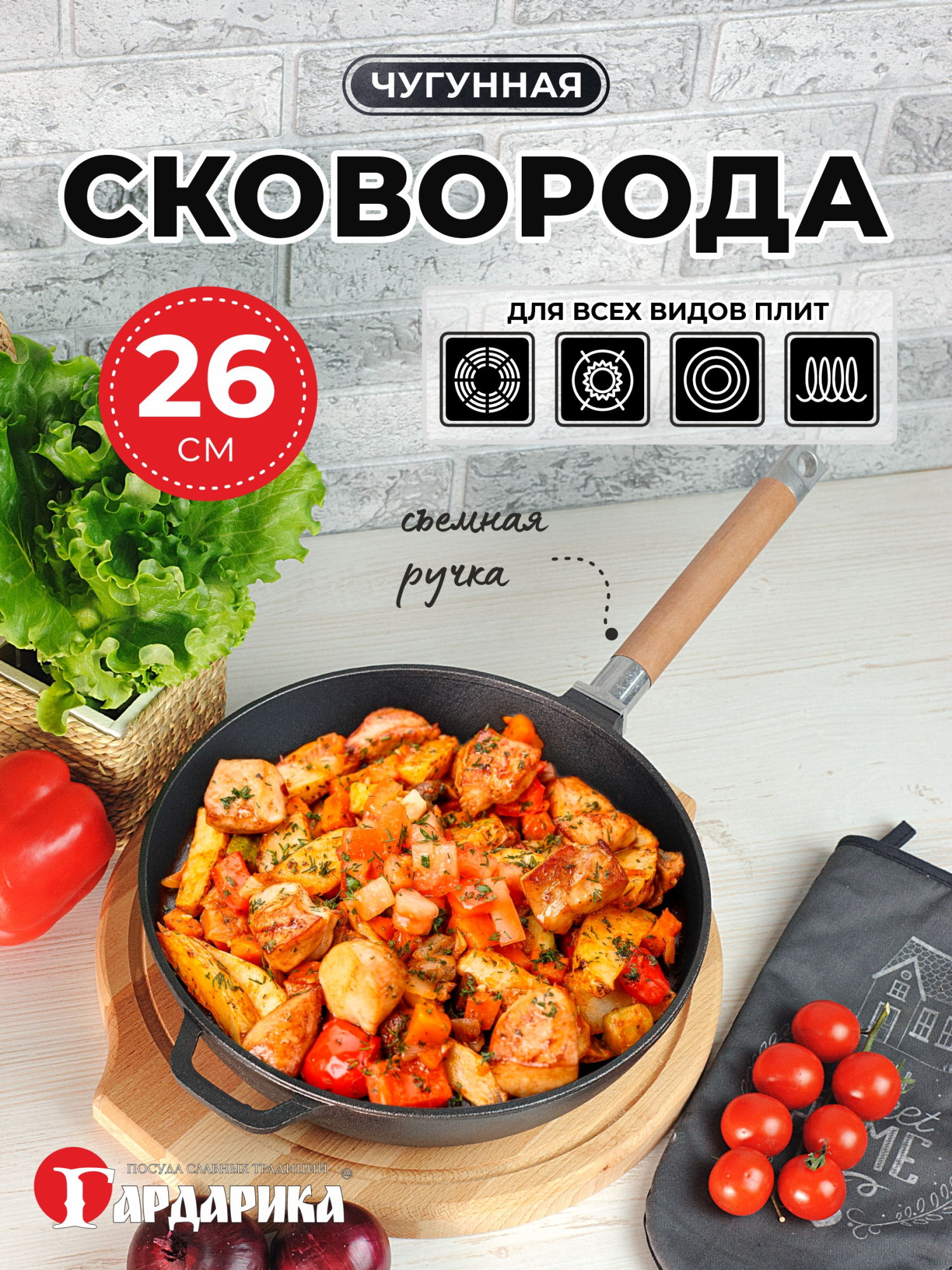 Чугунная сковорода-сотейник в диаметре 260мм имеет съемную деревянную ручку, что позволяет использовать ее в духовке.