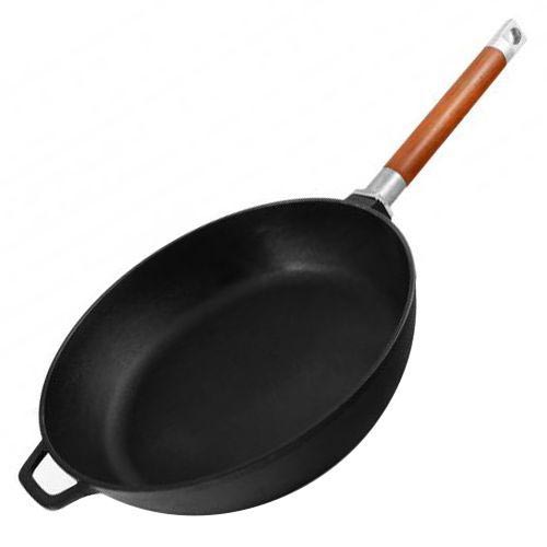 Чугунная сковорода-сотейник в диаметре 280мм имеет съемную деревянную ручку, что позволяет использовать ее в духовке.