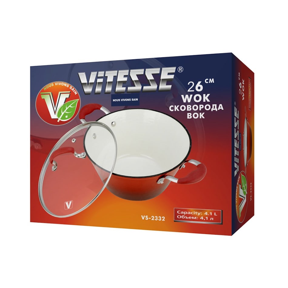Сковорода-вок "Vitesse" выполнена из чугуна, покрытого антикоррозийным составом, который безвреден для человека. Внутри и снаружи изделие обработано высококачественной эмалью, которая устойчива к температуре и повреждениям. Комплектуется стеклянной крышкой с пароотводом.