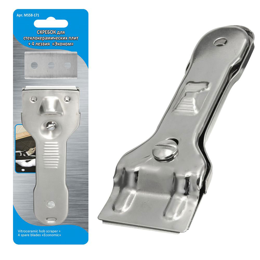 Скребок для стеклокерамических плит МУЛЬТИДОМ 4 лезвия Эконом предназначен для очистки стеклокерамики, кафельных или стеклянных поверхностей от засохшей или пригоревшей грязи. Регулярное использование скребка позволяет сэкономить время и силы, которые требуются для ухода за поверхностью, также это продлевает сроки эксплуатации плит. Для безопасности двухстороннее сменное лезвие имеет специальный предохранитель, оно выдвигается и фиксируется, что обеспечивает безопасность не только при использовании, но и при хранении изделия.