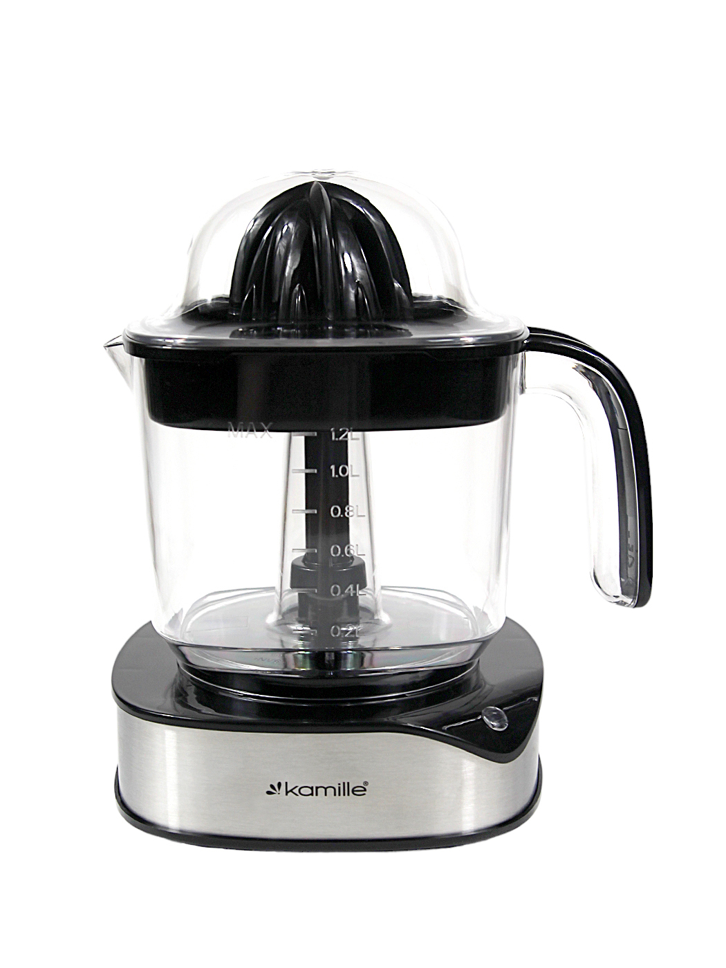 Соковыжималка для цитрусовых электрическая Kamille KM 6738 позволит в считанные секунды выдавить сок и подать его к столу. в удобном кувшине с ручкой и носиком, из которого удобно разливать фреш по стаканам.