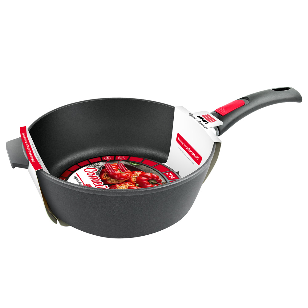 Сотейник НМП диаметром 24 см. Литой корпус прекрасно распределяет температуру. Дно и толстые стенки сотейника нагреваются постепенно: продукты в нем подвергаются термической обработке равномерно и деликатно на медленном огне, сохраняя свои полезные свойства.