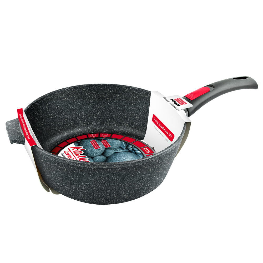 Сковорода НМП Каменная имеет покрытие с эффектом натурального камня "чёрный гранит". Практичный цвет помогает долго сохранять прекрасный внешним вид сковороды.
