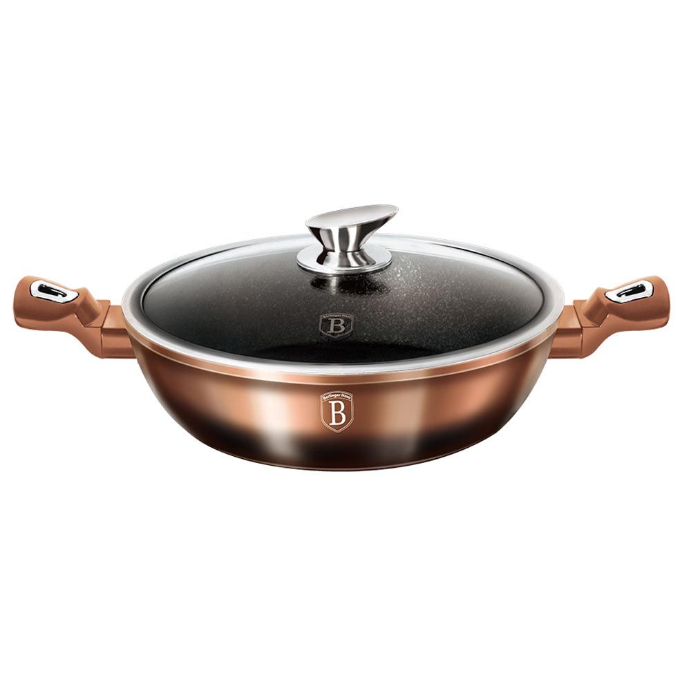Сотейник с крышкой "Rosegold Line" выполнена из кованого алюминия с 3-х слойным мраморным покрытием. Равномерное распределение температуры по всей поверхности обеспечивает быстрое приготовление пищи. Изделие имеет эргономичные ручки с покрытием "Soft touch" для более удобной переноски. Подходит для всех видов плит.
