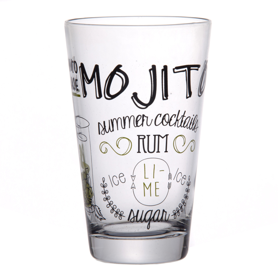 Стакан конической формы изготовлен из натрий-кальций-силикатного стекла. Декорирован тематическим рисунком Мохито.