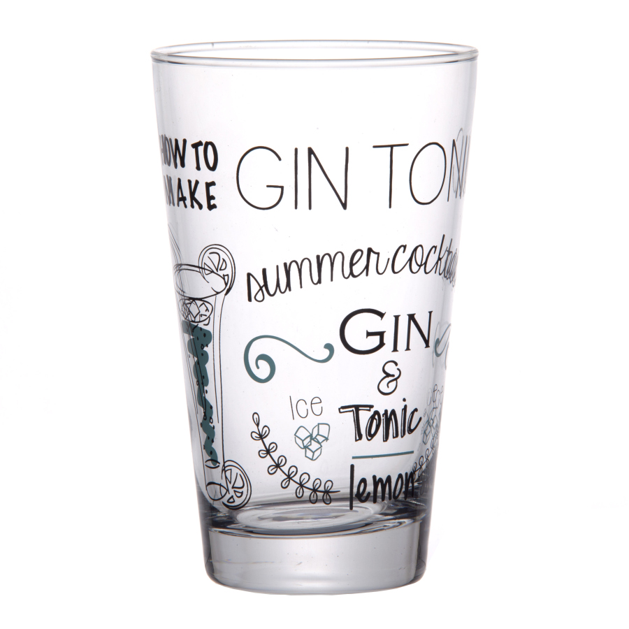 Стакан конической формы изготовлен из натрий-кальций-силикатного стекла. Декорирован тематическим рисунком Джин Тоник.