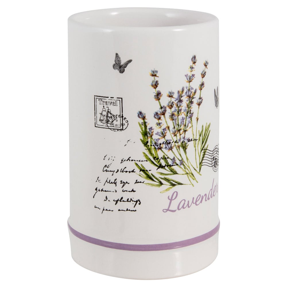 Керамический стакан с рисунком "Лаванда" может использоваться как подставка для зубных щеток и пасты, так и для полоскания рта.