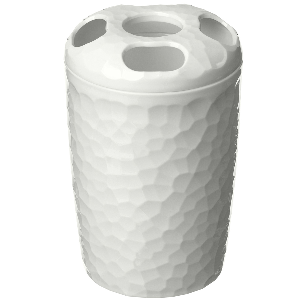 Универсальный стакан для зубных щетокTule отличается оригинальным декором стенок, дизайн напоминает эффект струящейся воды или вид обработанного природного камня, что придаст изюминки интерьеру ванной комнаты. Стакан входит в единую коллекцию предметов для ванной Tule, что позволит создать коллекционную систему хранения для мыла и зубных щеток. На крышке предусмотрены четыре отверстия для хранения зубных щеток или бритвенных принадлежностей. Крышка легко снимается и закрывается до защелкивания.