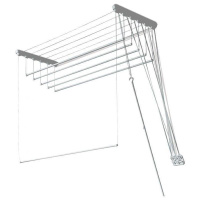 Сушилка представляет собой пластиковые стержни, закрепленные при помощи направляющих шнуров на стальных кронштейнах, которые в свою очередь крепятся на стену или потолок.
