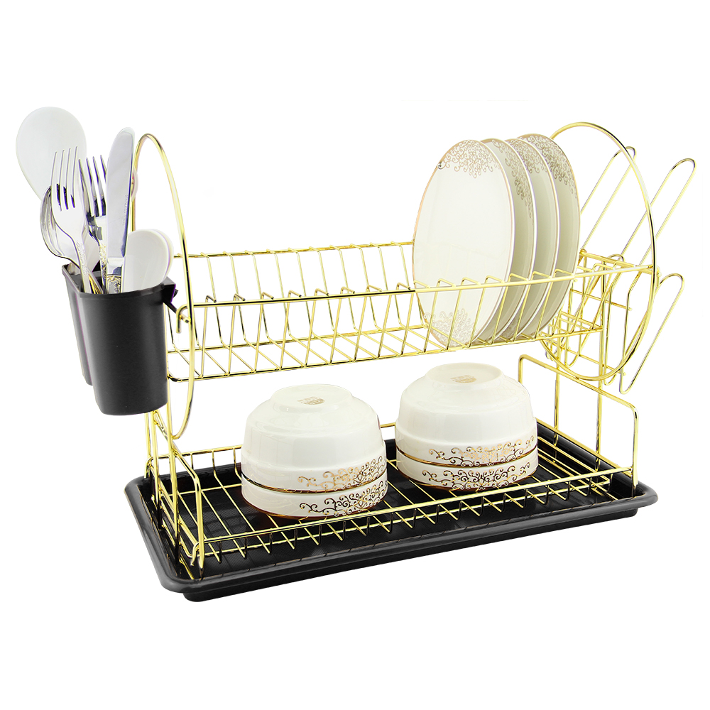 Сушилка для посуды (размер: 500 мм x 235 мм x 330 мм), материал – высококачественная сталь "под золото", поддон из полипропилена, 2-уровня для посуды, подставка для столовых приборов, держатели для стаканов. Подарочная упаковка с пластиковой ручкой.