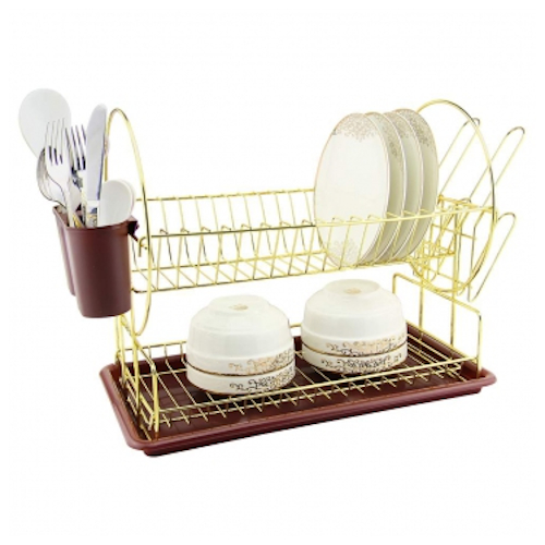 Сушилка для посуды Zeidan (размер: 500 мм x 235 мм x 330 мм), материал – высококачественная сталь "под золото", поддон из полипропилена, 2-уровня для посуды, подставка для столовых приборов, держатели для стаканов. Подарочная упаковка с пластиковой ручкой.