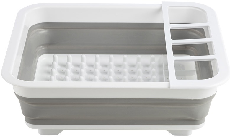 Складная сушилка для посуды Unico поможет вам быстро и удобно высушить блюда и столовые приборы. Специальные разделители на дне позволят уместить сразу несколько рядов посуды, а высокие бортики не позволят ей соскользнуть. Сбоку имеются держатели для вилок, ложек и ножей. Когда в сушилке для посуды не будет необходимости Вы ее сможете сложить и спрятать в шкаф. Места для нее много не нужно, именно это и является преимуществом. Такая портативная сушилка для посуды будет незаменимым атрибутом на летней кухне или на даче. Также, в офисных столовых и общежитиях. Размер 36*31*11,5 см. Материал: АВС пластика и силикона в комбинации белого и серого цветов. Конструкция стойкая к механическим повреждениям.