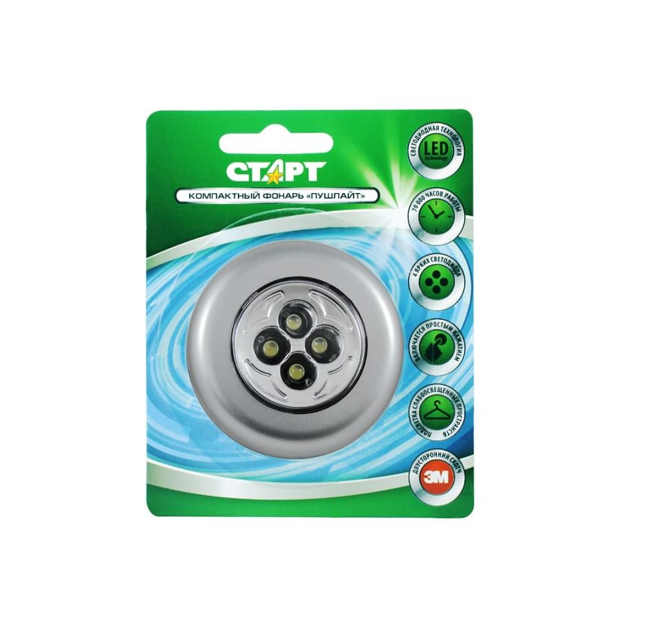 Светодиодный точечный пушлайт-светильник СТАРТ PL-4led С1 серебро предназначен для создания дополнительного освещения в помещении. Корпус изготовлен из пластика. Устройство обладает 4 светодиодами и работает от 3 батареек типа ААА. Крепится на любую ровную поверхность при помощи двухстороннего скотча.