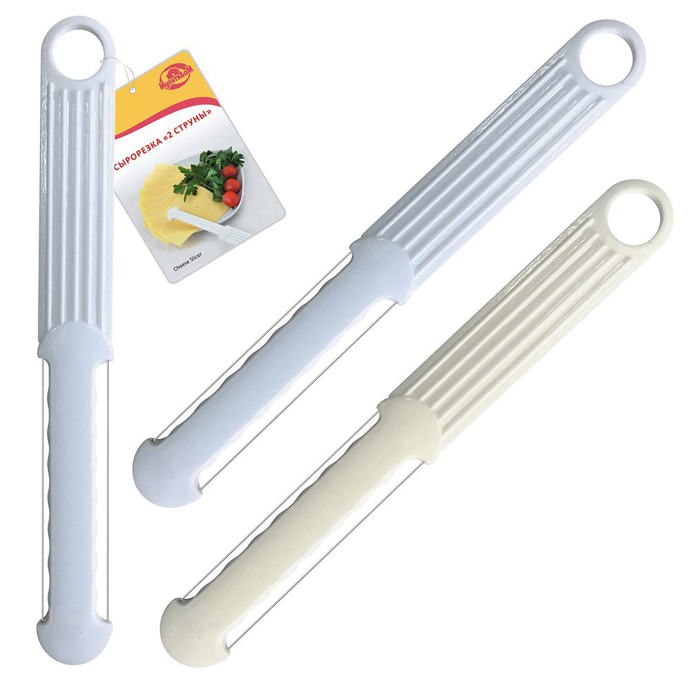С сырорезкой вы легко нарежете сыр на аккуратные ломтики. Струны с обеих сторон изделия зафиксированы на разной высоте, что позволяет получать ломтики разной толщины.