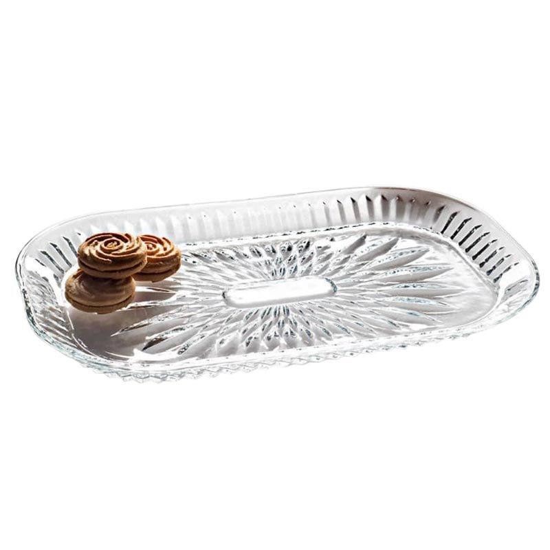 Блюдо стеклянное, прямоугольной формы, прозрачное с рельефным узором.