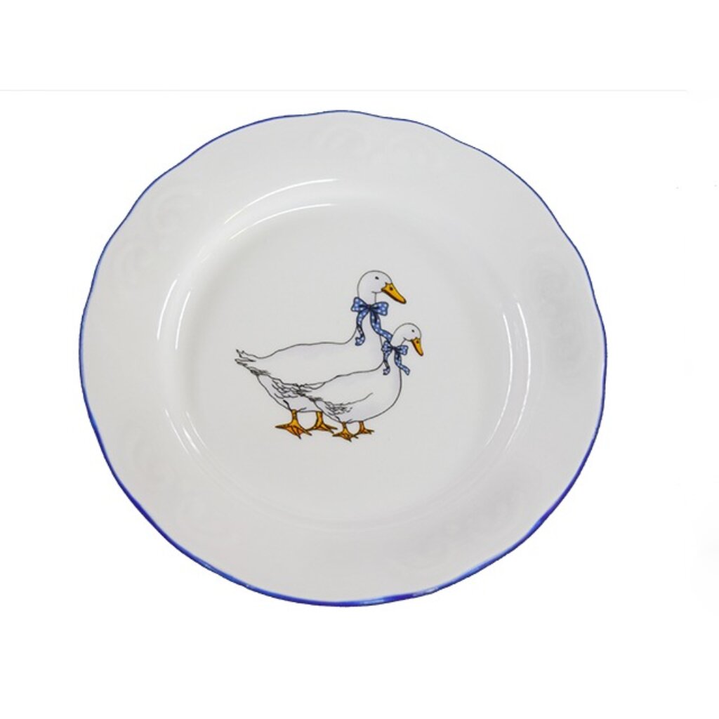 Тарелка глубокая фарфоровая от Добрушского фарфорового завода имеет изысканный рисунок "Гуси" и изящную форму "Надежда" Подходит для подачи различных блюд: закусок, первых блюд или фруктов. Такая тарелка украсит ваш праздничный или обеденный стол, а оригинальный дизайн придётся по вкусу и ценителям классики, и тем, кто предпочитает утонченность и изысканность. Диаметр изделия 22 см, высота 4,2 см, объём 350 мл. Твердый фарфор довольно прочный, экологически чистый и прослужим вам много лет. Изделия из фарфора можно использовать в микроволновых печах и мыть в посудомоечной машине на щедящем режиме.