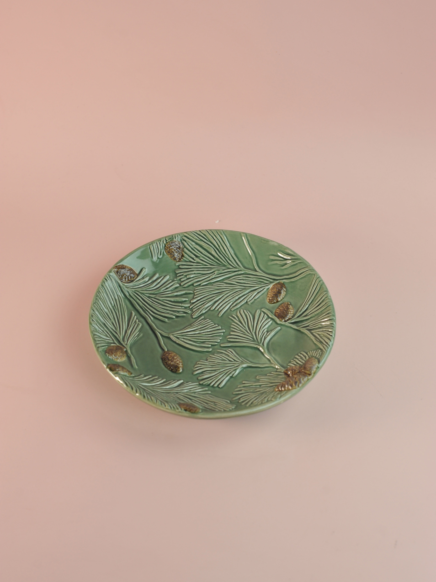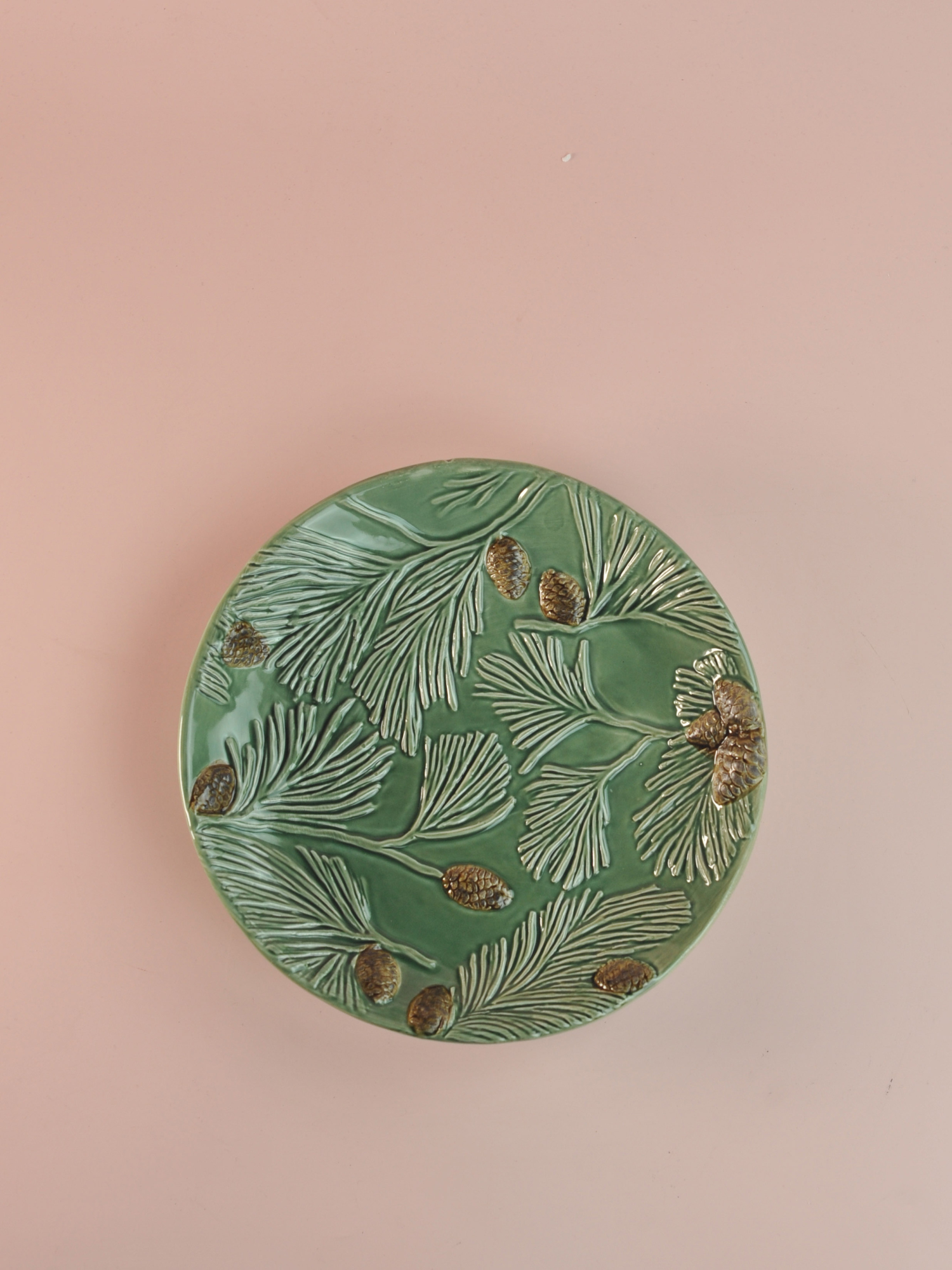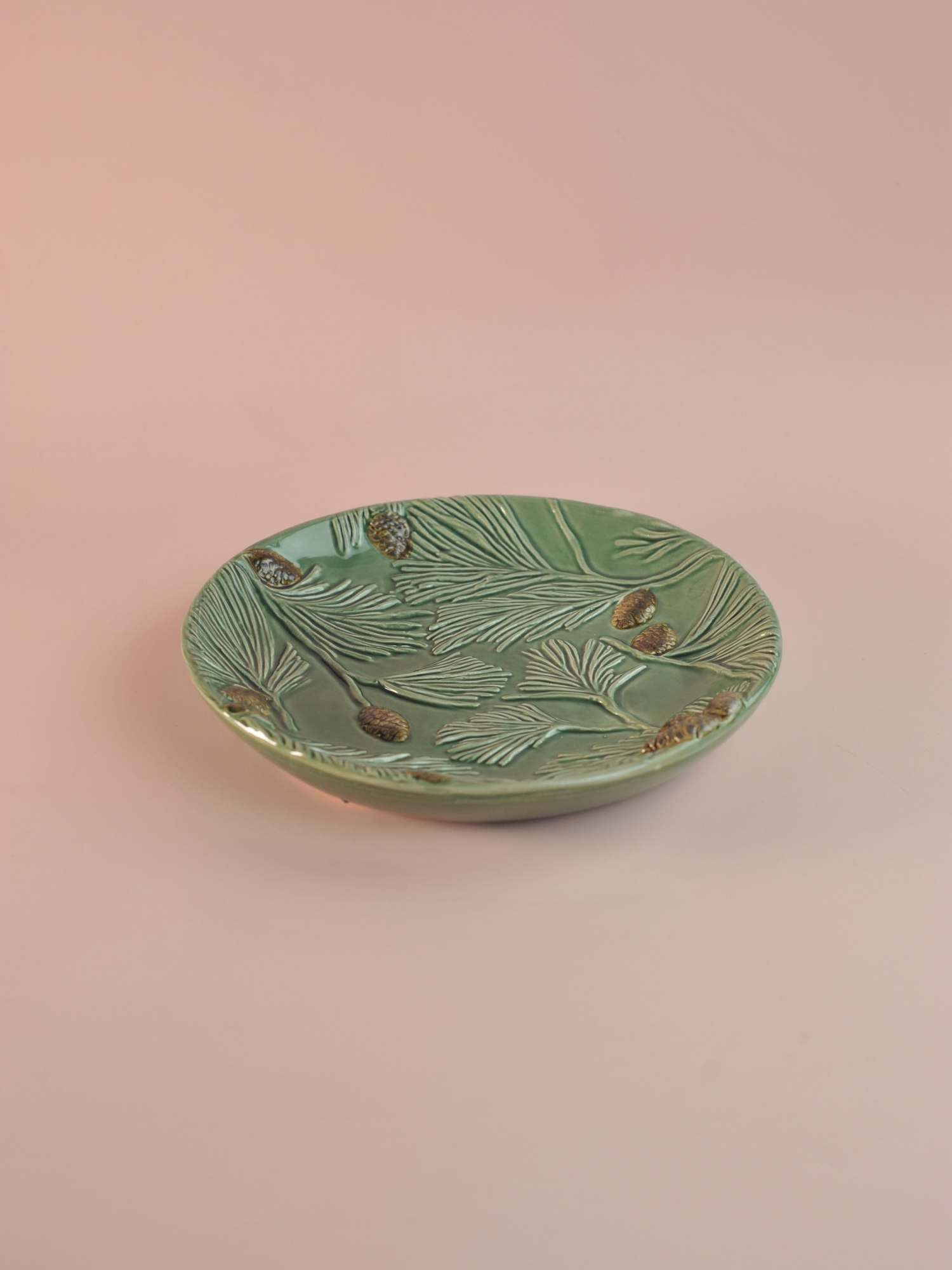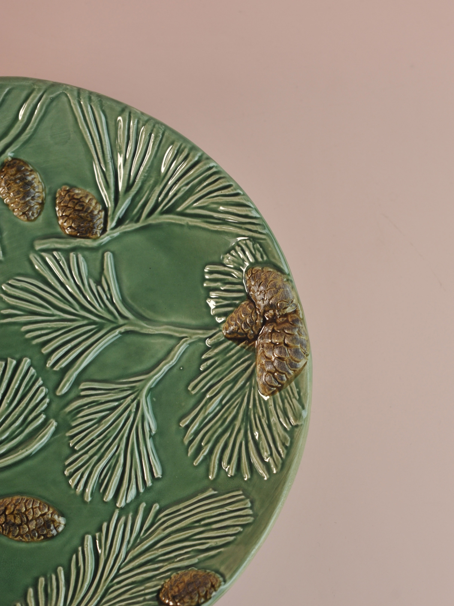 Наша посуда отличается насыщенными зелеными оттенками, которые ассоциируются с зимним лесом и свежестью природы. Объемные шишки и сосновые ветки, изящно оформленные на поверхности изделий, создают поистине волшебную атмосферу, способную перенести вас в сказочный лес. Эти элементы дизайна представлены с особым вниманием к деталям, что подчеркивает уникальность каждого изделия.