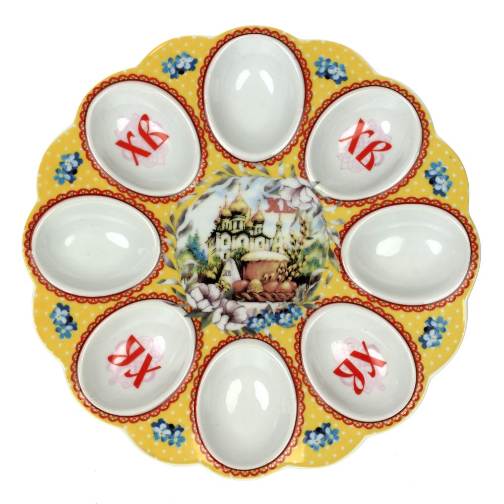 Тарелка предназначен для украшения интерьера на Пасху, для подачи куличей и яиц. Также станет ярким элементом для Вашего стола в любой другой день. Изделие рассчитано для 8-ми яиц, изготовлена из фарфора.