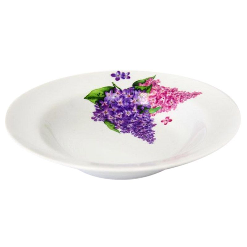 Тарелка глубокая ф653 "Идиллия" d24см с деколью "Сирень" используется для подачи первых блюд, как горячих, так и холодных.