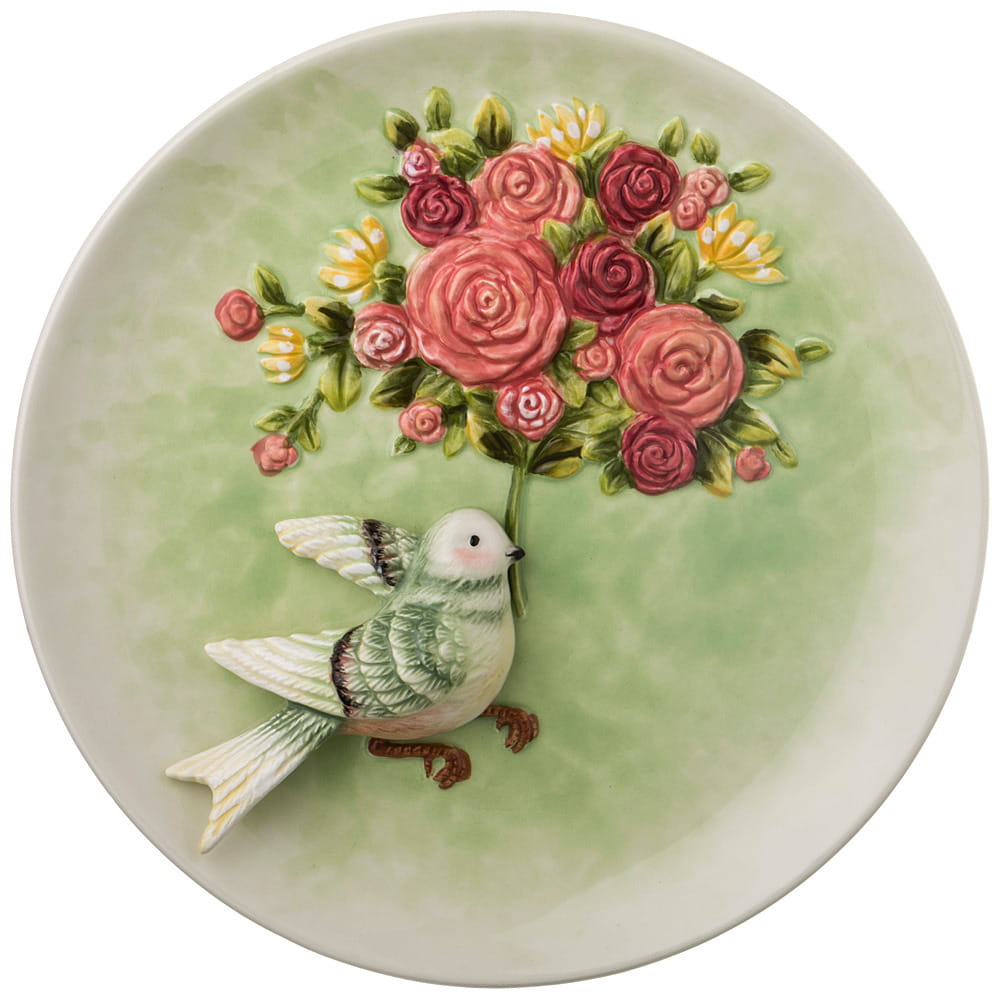 Декоративная тарелка из керамики с металлическим подвесом с обратной стороны.