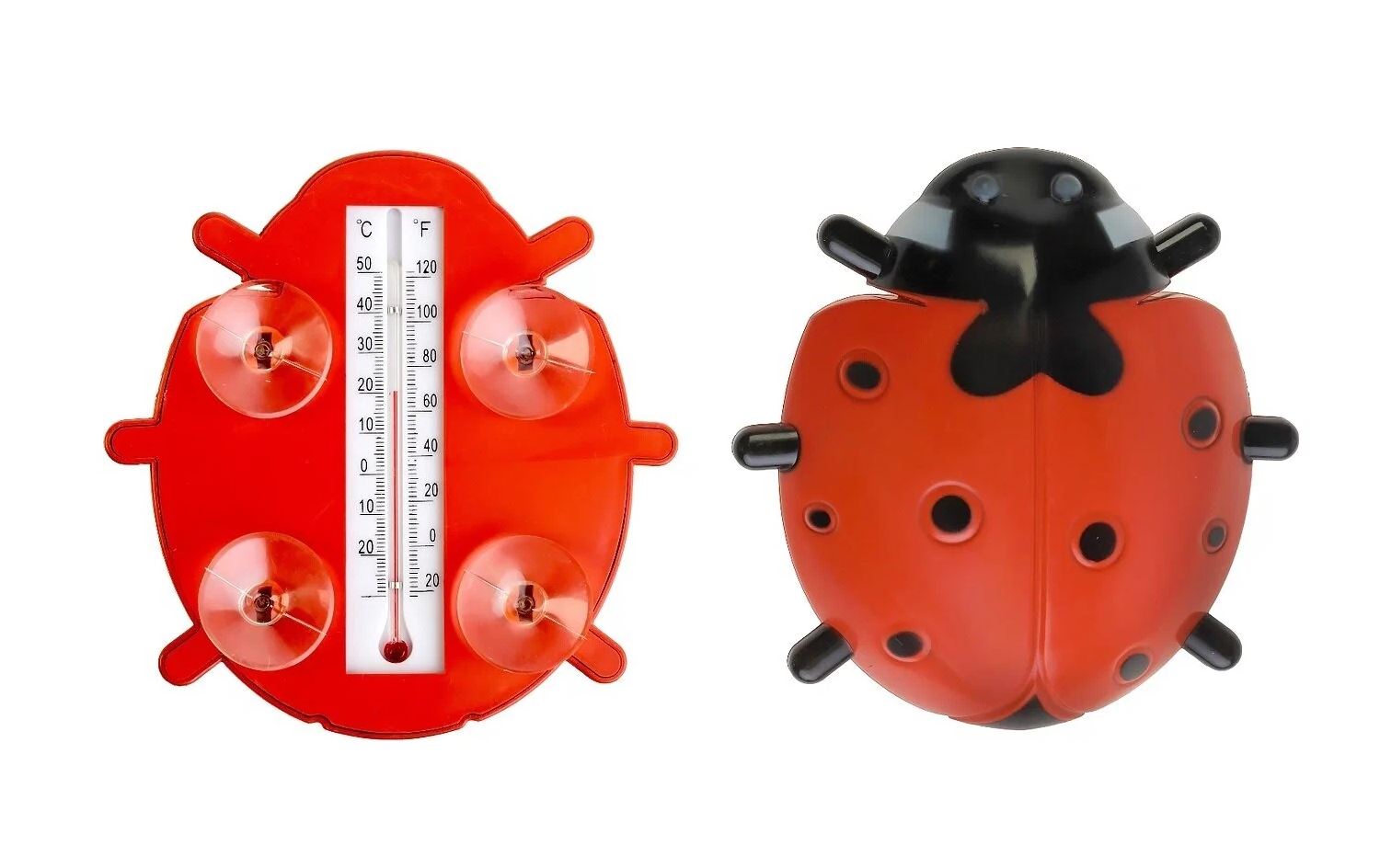 Уличный термометр Божья коровка – отличный вариант для проверки температуры снаружи помещения. Веселый и яркий дизайн понравится как взрослым, так и детям. Корпус производится из прочного пластика, которому не страшны перепады температуры и осадки. Термометр крепится на окно с помощью присосок. Жидкость, которая налита в температурный столбик, не содержит в составе ртути, поэтому термометр безопасен в эксплуатации.
