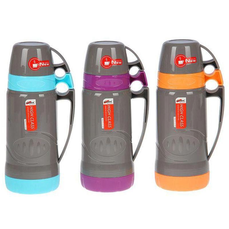 Термос 1,8л со стеклянной колбой и в пластиковом корпусе имеет две кружки и ручку для переноски.