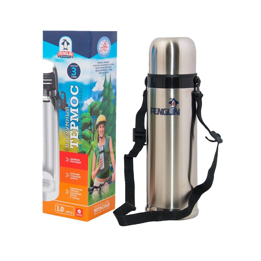 Термос объемом 1,0 литр, снабжен глухой пробкой с ремешком.